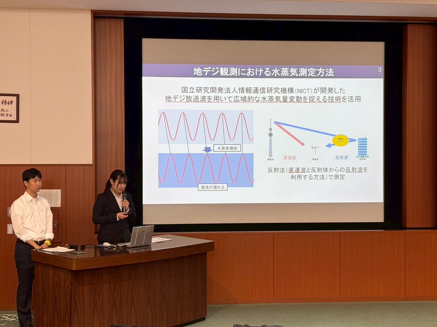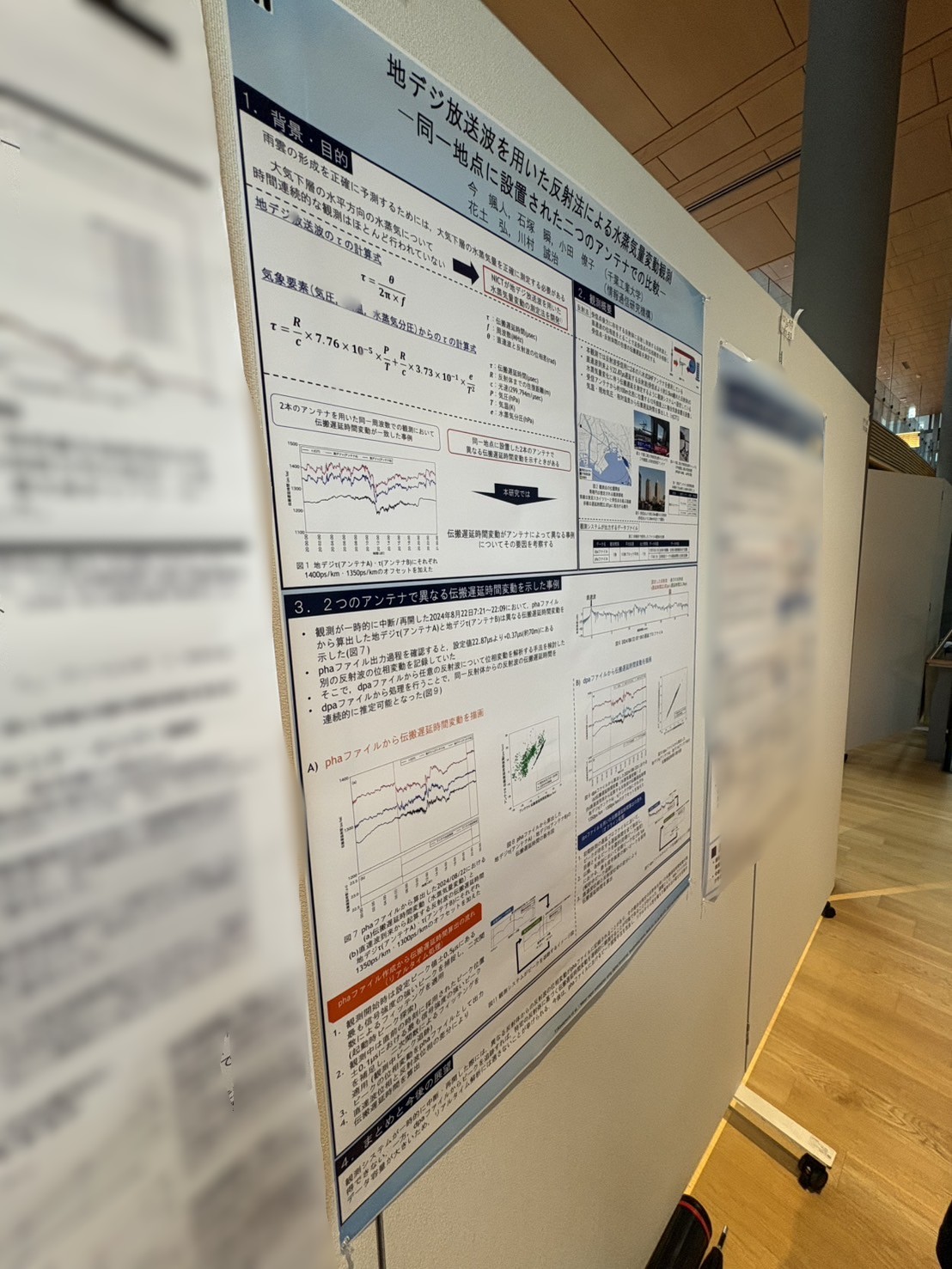 あきた芸術劇場ミルハスで開催された水文・水資源学会 2025年度研究発表会(9月17日~19日)でポスター発表を行いました! ミルハス,駅から近くて新しい&綺麗なところでした!となりの千秋公園お堀のハスの花が一部残っており,大きな葉と花に魅了されました. というわけで,水文・水資源学会の様子をお届けします. 私は,『地デジ放送波を用いた反射法による水蒸気量変動観測-同一地点に設置された二つのアンテナでの比較-』というながーいタイトル名. 多くの方に見てもらえた!わけではないのですが…同じ地デジ観測を行う方々と深い話ができ大変有意義な時間でした. 次はもっと多くの方に地デジ水蒸気観測を理解していただけるような資料作りを心掛けていきたいですね. さて,開催地は秋田ということで,きりたんぽやバター餅,ババヘラアイスなど沢山グルメも楽しんできました.あまりにも美味しくて写真を撮るのを忘れてしまいました…(唯一撮ったババヘラアイスをおすそわけです!)